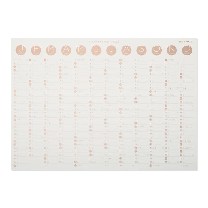 This exclusive 2026 wall calendar from the Bethge screen-printing workshop is ideal for clear, at-a-glance planning of personal and business appointments—and looks equally stylish at home or in the office. Printed on premium white fine paper (220 g/m²) sourced from a German paper mill, each calendar is crafted with meticulous care: all lettering is applied by hand, and the copper ink with effect pigments catches the light with a refined, elegant shimmer.