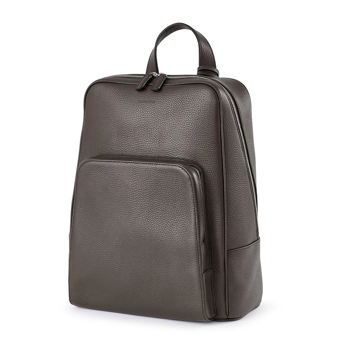 The Adri backpack is the refined answer to modern workdays on the move and effortless business travel. Handcrafted in an Italian workshop, it pairs clean lines with soft, pebbled full-grain leather—a confident companion for everyday life and trips alike. Its minimalist rectangular silhouette feels deliberately urban yet timeless, available in understated, easy-to-style colours such as aubergine, dark brown, dark blue, taupe or black.