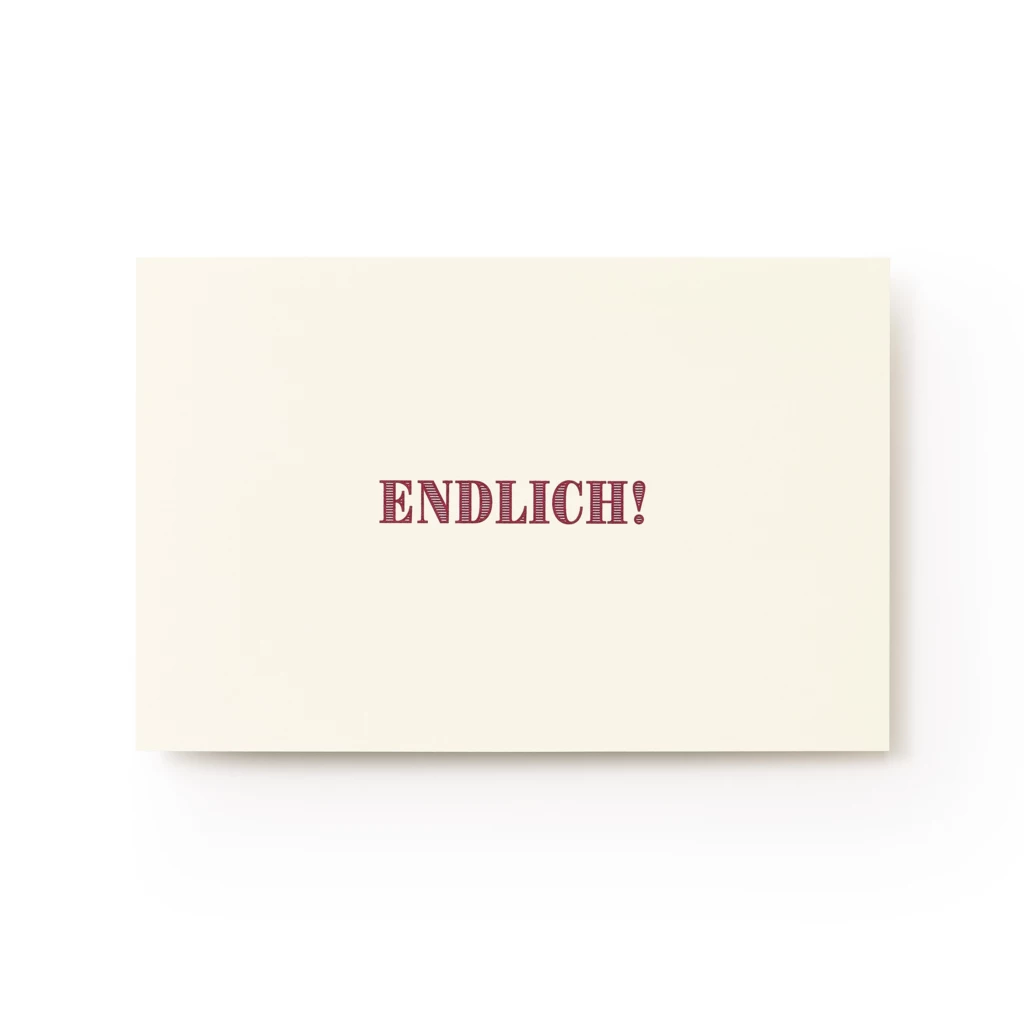 - Schriftzug „ENDLICH!" im Handsiebdruck auf cremefarbenem Papier