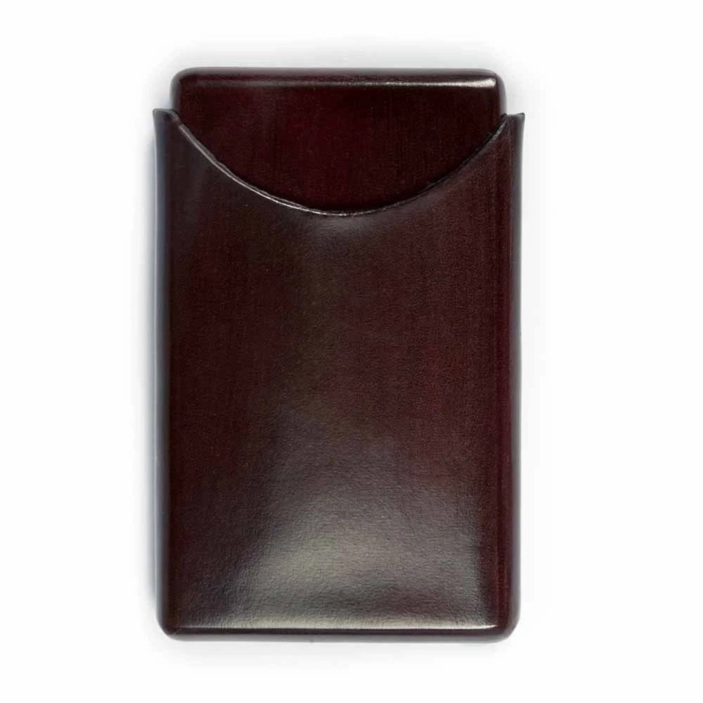 This exquisite business card holder consists of two parts – one part neatly fits into the other. The case provides an elegant presentation of your business cards whilst protecting your business cards from being damaged. The rounded opening enables the cards to be easily removed. The vegetable-tanned cowhide is a durable material and is handcrafted using a wooden mould to achieve the desired shape. No seams (and hence stitching) are necessary using this method, resulting in a perfect example of minimalism. The leather is then painted by hand before wax is applied, thus giving it a natural grip when held. Over time, the leather acquires a beautiful patina that results in different hues of the respective colour.