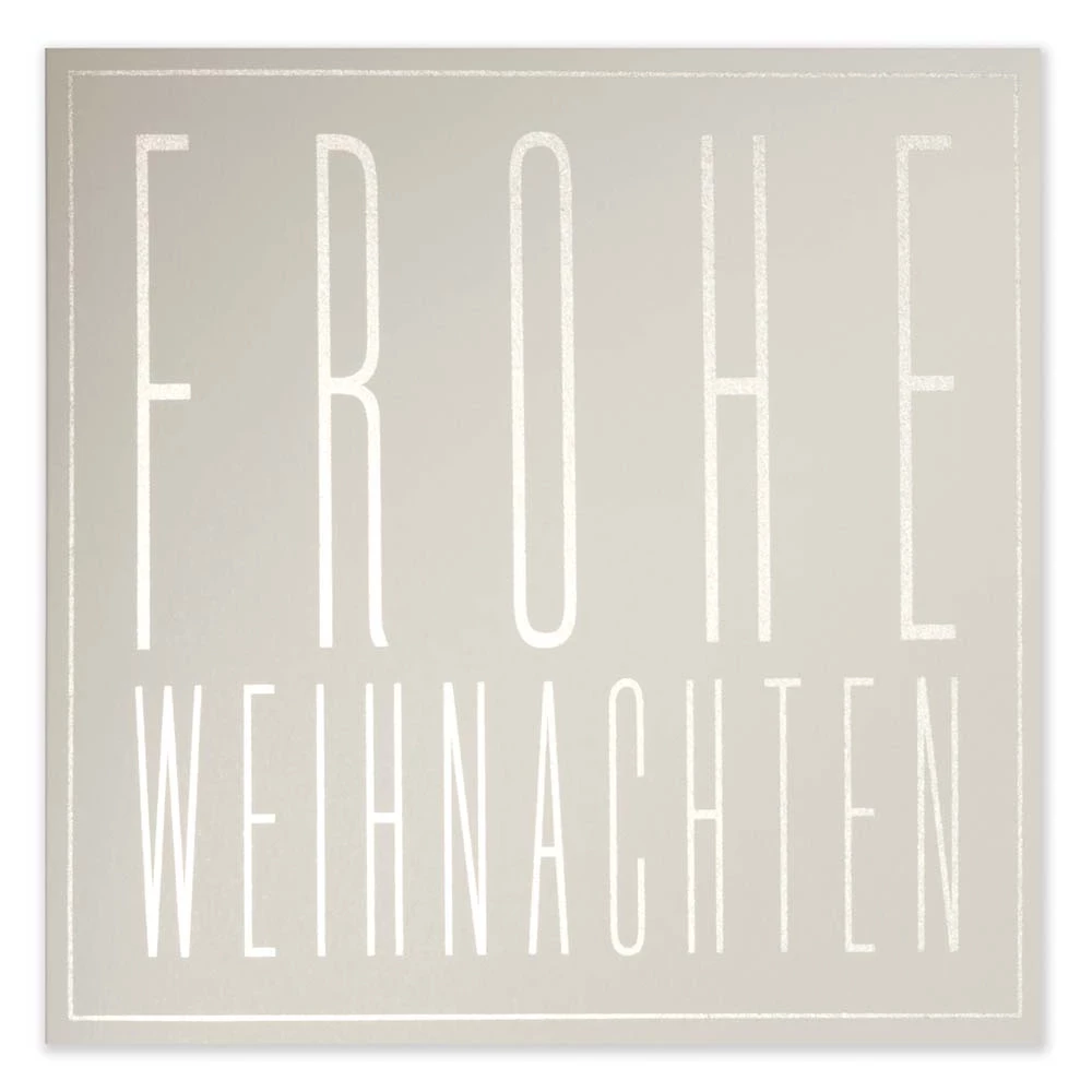 Simple yet elegant and modern. Produced in our own print shop using elaborate screen printing on fine 270 g/m² Pure Sand paper, printed in a single color with the wording “Frohe Weihnachten.” Supplied with a matching Opal Ecru envelope, 14.6 × 14.6 cm, pointed flap, gray silk lining.