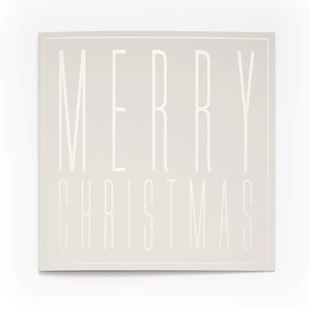 Simple yet elegant and modern. Produced in our own print shop using elaborate screen printing on fine 270 g/m² Pure Sand paper, printed in a single color with the wording “Merry Christmas.” Supplied with a matching Opal Ecru envelope, 14.6 × 14.6 cm, pointed flap, gray silk lining.