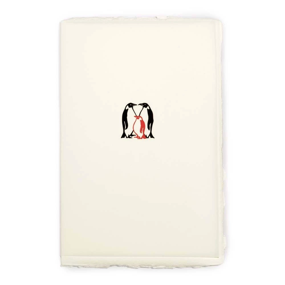 Penguin family. Rag-paper folded card for a birth and for penguin lovers. With hand-printed transparent overlay. Envelope made of rag paper without lining.