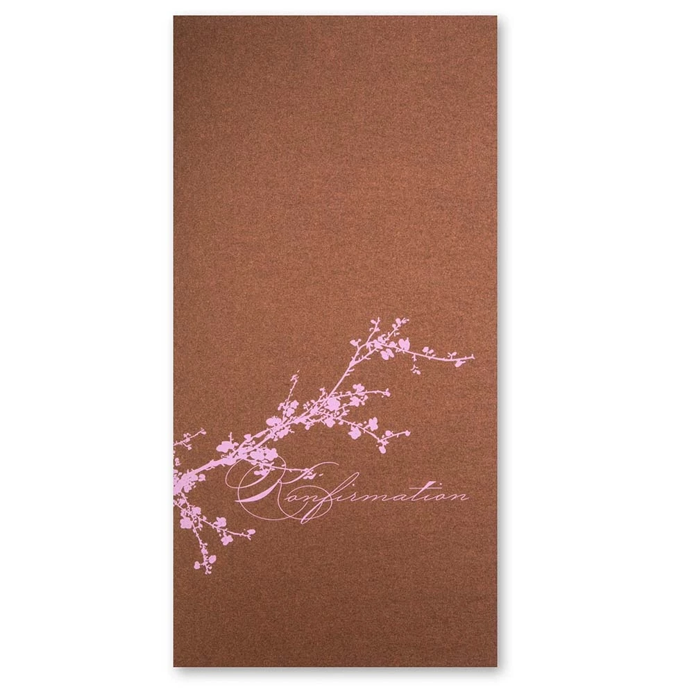 First Communion card with cherry-blossom motif in pink. DL-format card with white insert and envelope with white silk lining.