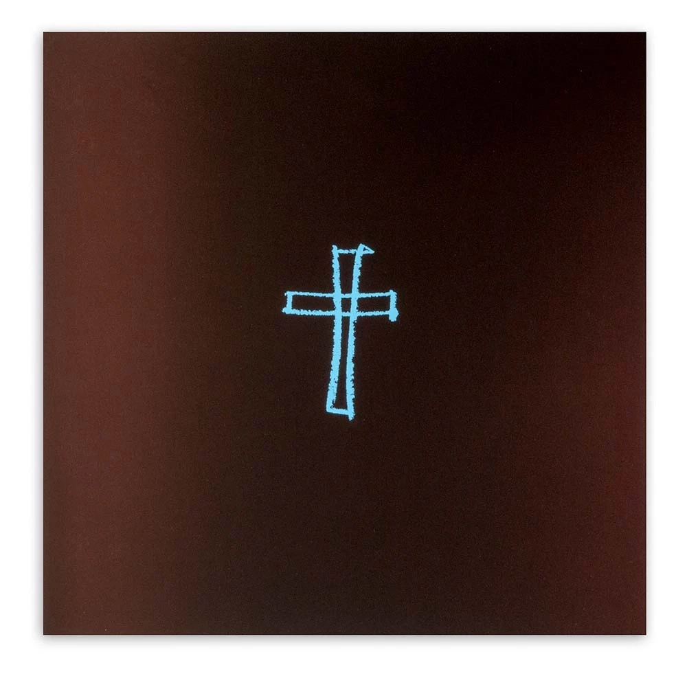 Folding card for Communion and Confirmation on elegant Pure stock. Dark brown outside, white inside. A light-blue cross is printed by hand on the cover. Format 15.8 × 15.8 cm. With matching envelope.