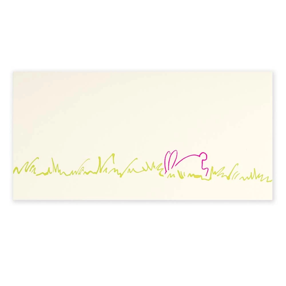Idea and execution come from Bethge’s in-house design and screen-printing studio, which also carries out the two-color print. In high-quality screen printing, two passes are used: first the green grass, then the neon-pink Easter bunny. A matching DL (DIN-lang) envelope is included.