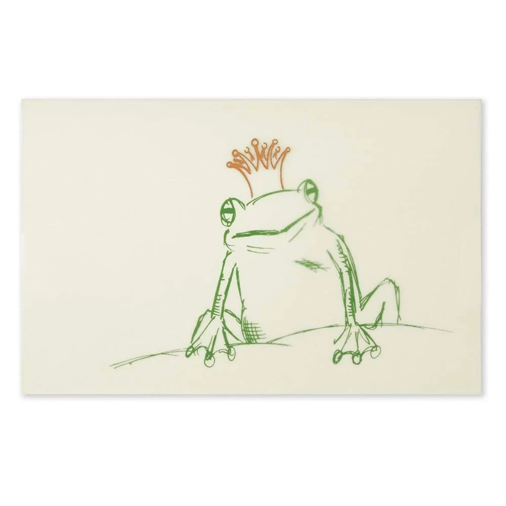 This refined greeting card, produced in manual screen printing, unfolds its full effect in combination with the transparent wrap. The wrap bears a golden crown—also screen-printed by hand—turning the frog on the card into the frog prince. The card stock is a lightly shimmering pearl-green (310 g/m²); the print color is green. Supplied with a matching transparent, pointed-flap envelope in 12 × 18 cm.