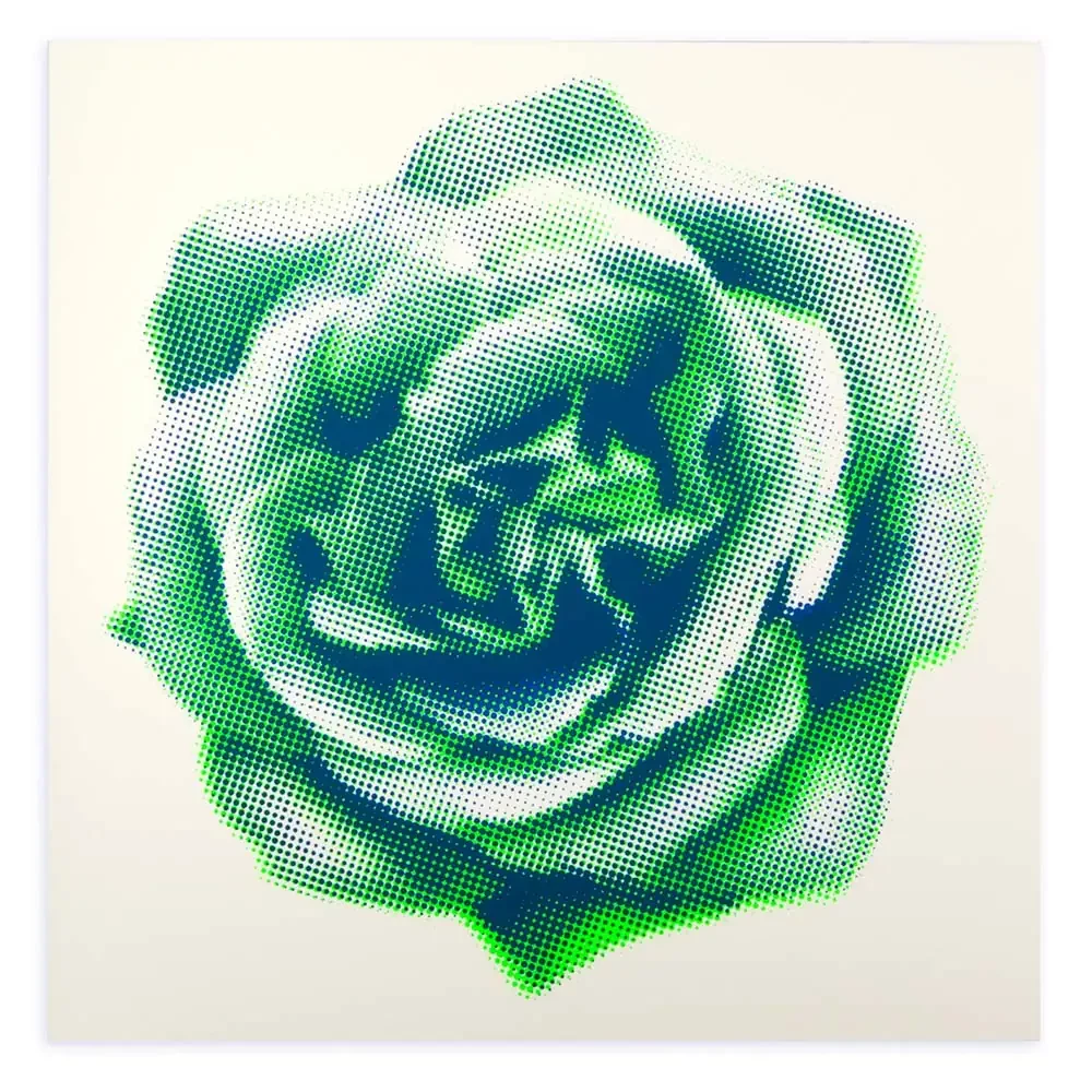 A halftoned rose in a blue-green palette for birthdays, weddings, and more. Hand-printed in screen printing on Opal Ecru stock; card size 158 × 158 mm. Matching silk-lined envelope.
