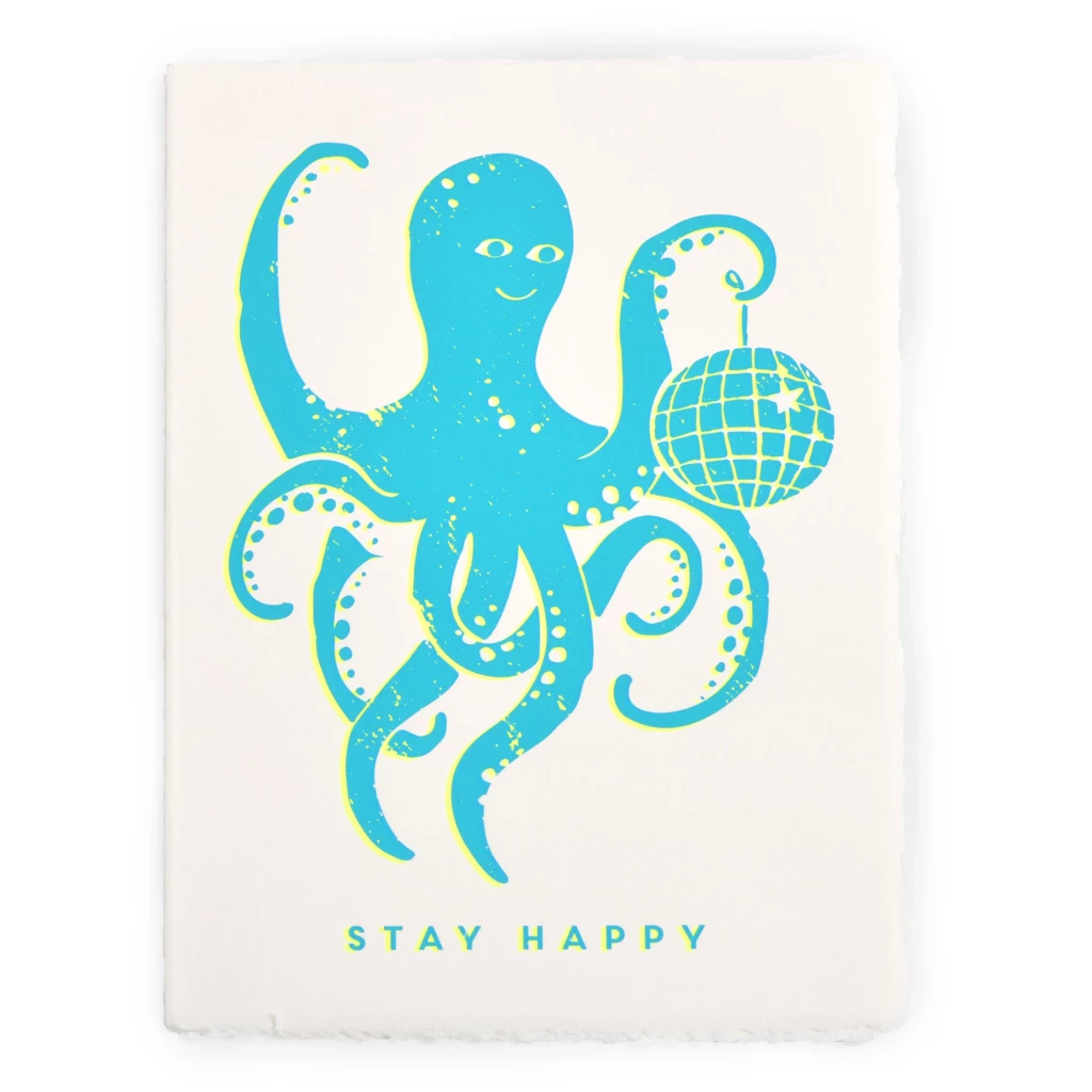 This handmade mould-made card with a cheerful octopus motif and a shiny disco ball puts you in a good mood. Produced by screen printing, it impresses with bright colours and high-quality workmanship. Perfect for positive messages that leave a smile!