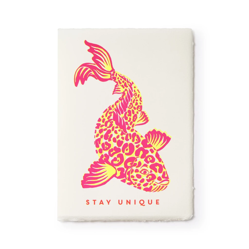 This handmade mould-made card with a striking fish motif in a vibrant leopard pattern draws all eyes. Produced by screen printing, it radiates individuality and creativity—perfect for sending special greetings that inspire and delight.