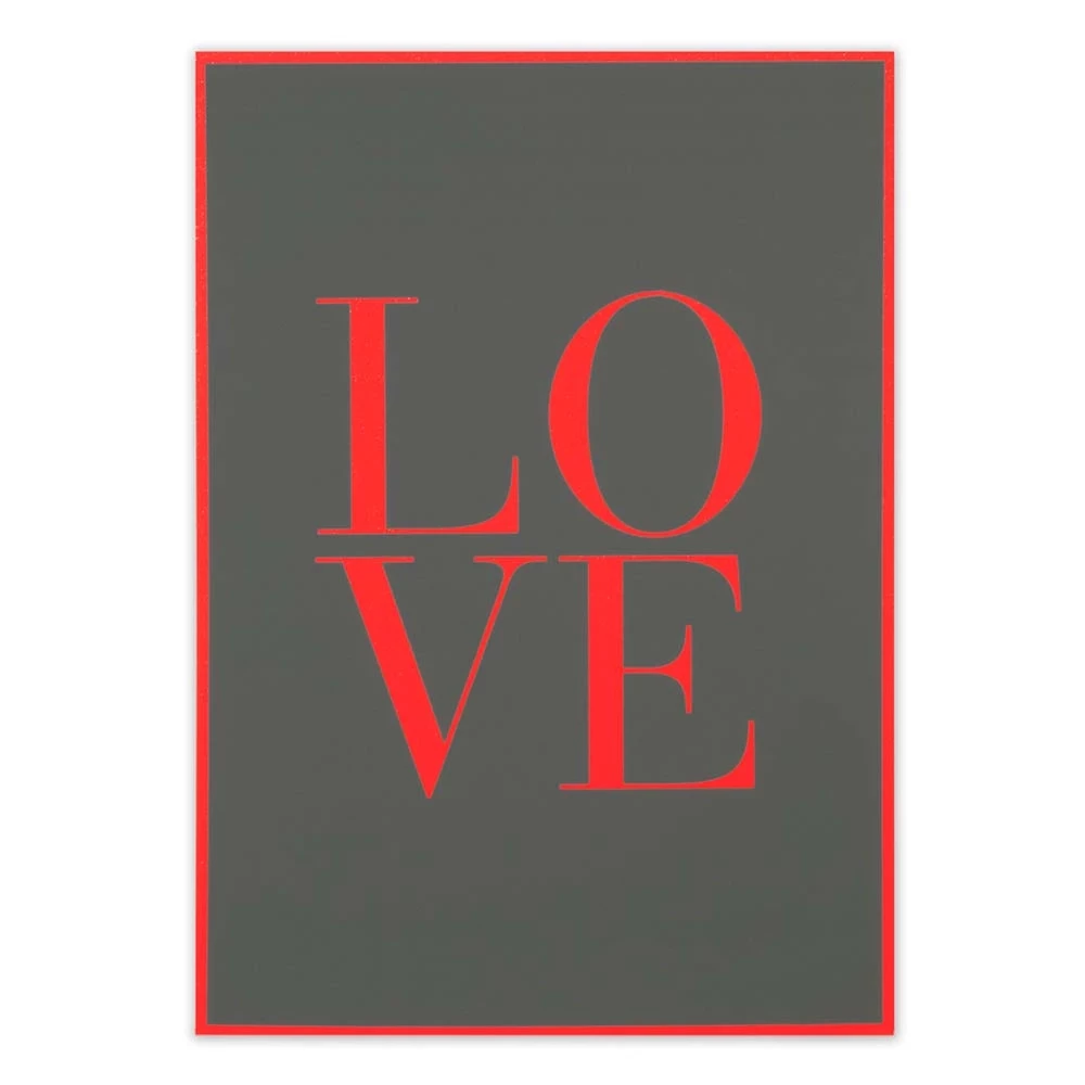 Our “Love” Valentine’s card in A4 with matching envelope is something truly special: it is printed on fine paper from Gmund. This fascinating, shimmering purple-red paper was infused with metallic particles during papermaking—the high art of the craft—creating a unique character as the light changes. Pure glamour.