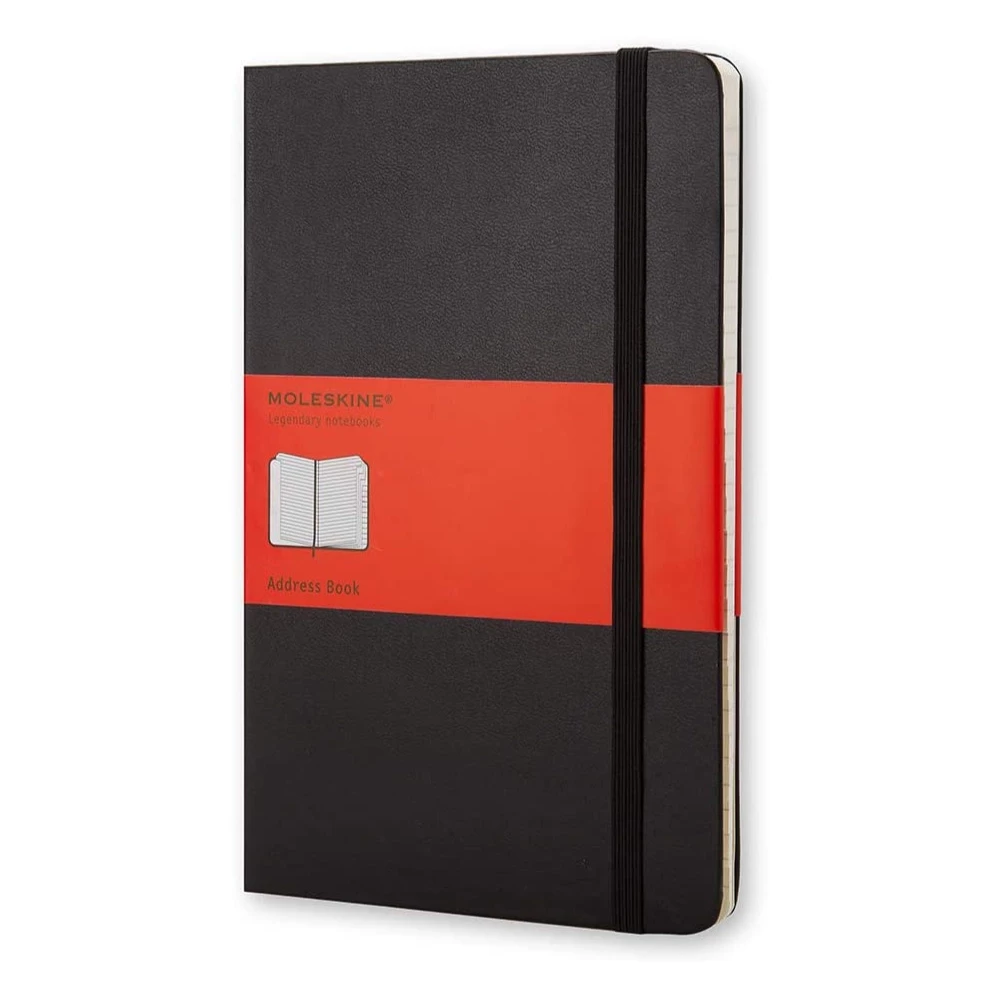 The Moleskine address book in classic black with ruled pages and a laminated alphabetical overview. Inspired by the no-frills, functional design of the classic notebook, the Moleskine address books contain a “in case of loss” label, a colour-matched elastic closure and a ribbon bookmark as well as a fold-out inside pocket for storing receipts, business cards and other notes.