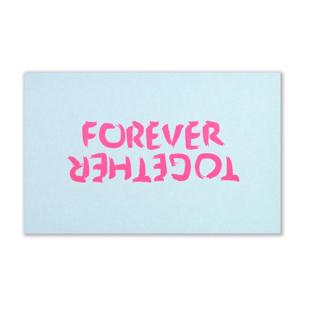 Das GMUND Papier mit Perlmutt-Effekt in Hellblau, 310 g/m², gibt der Karte eine schimmernde Oberfläche, die je nach Lichteinfall zwischen Blau und Weiß changiert. Der Schriftzug „Together Forever" ist im Siebdruck mit echter Neonfarbe aufgebracht, einer Farbe mit hoher Leuchtkraft, die auf dem Perlmutt-Untergrund besonders intensiv wirkt. Der Kontrast zwischen dem kühlen Blau des Papiers und dem warmen, strahlenden Pink des Drucks ist präzise gesetzt und trägt die Energie des Motivs.