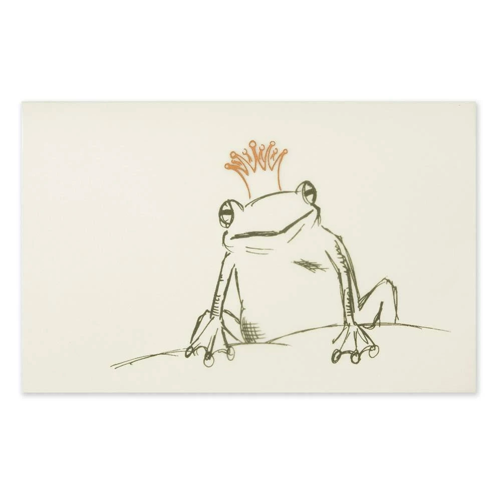 This refined greeting card, produced in manual screen printing, unfolds its full effect in combination with the transparent wrap. The wrap bears a golden crown—also screen-printed by hand—turning the frog on the card into the frog prince. The card stock is a lightly shimmering pearl-green (310 g/m²); the print color is black. Supplied with a matching transparent, pointed-flap envelope in 12 × 18 cm.